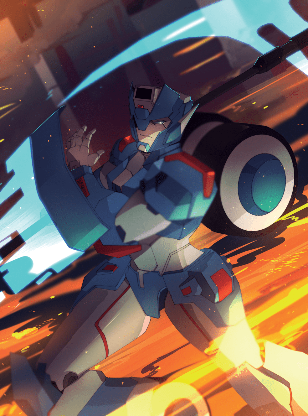 [image: Fanart of Chromia from IDW Transformers. She’s running into the action, shield held up in front of her and battle-ax swung back behind, a stern expression on her face. Around her the blue background is filled with a rush of bright yellow and pink motion.]
